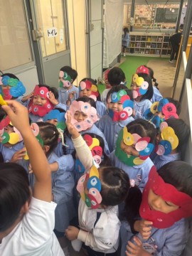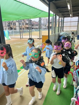 保育風景 ハロウィン🎃 2025年10月31日(金) おやつくれなきゃいたずらするよ〜 それぞれの好きな仮装を作ったり、年少さんにキャンディのプレゼントをしたり。年中さんのハロウィンは、今年盛り上がったミャクミャクです!園長先生からも、アメをもらってみんなで食べました🍬 もどる